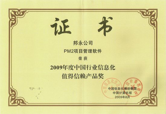 2、2009年,邦永科技公司憑借PM2項目管理軟件,被中國信息化推進聯(lián)盟評為“中國行業(yè)信息化值得信賴獎”。