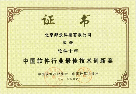 3、2010年,邦永科技公司憑借PM2項目管理系統(tǒng)的不同行業(yè)版本,一舉奪得了中國軟件行業(yè)協(xié)會評出的“軟件十年,中國軟件行業(yè)最佳技術(shù)創(chuàng)新獎”。