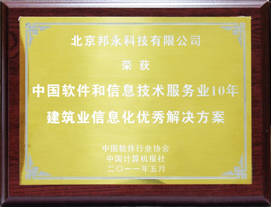10、北京邦永科技公司榮獲“中國軟件和信息技術(shù)服務(wù)業(yè)10年建筑業(yè)信息化優(yōu)秀解決方案”獎。