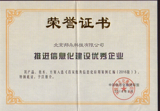 23、北京邦永科技有限公司榮獲2016年“推進信息化建設(shè)優(yōu)秀企業(yè)”榮譽證書 |