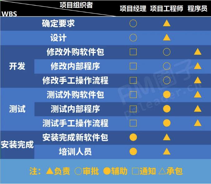 比如,在上圖這個案例中,在第三行的【修改外購軟件包】這項工作中,程序員是負(fù)責(zé)人▲,項目工程師負(fù)責(zé)審批○,決定該工作是否通過,項目經(jīng)理只需要被通知□,了解工作進(jìn)展就可以了。