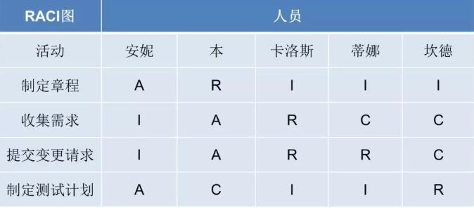 責(zé)任分配矩陣有不同的形式,上圖這個是用符號表示的,此外,還有我們熟悉的RACI責(zé)任分配矩陣。