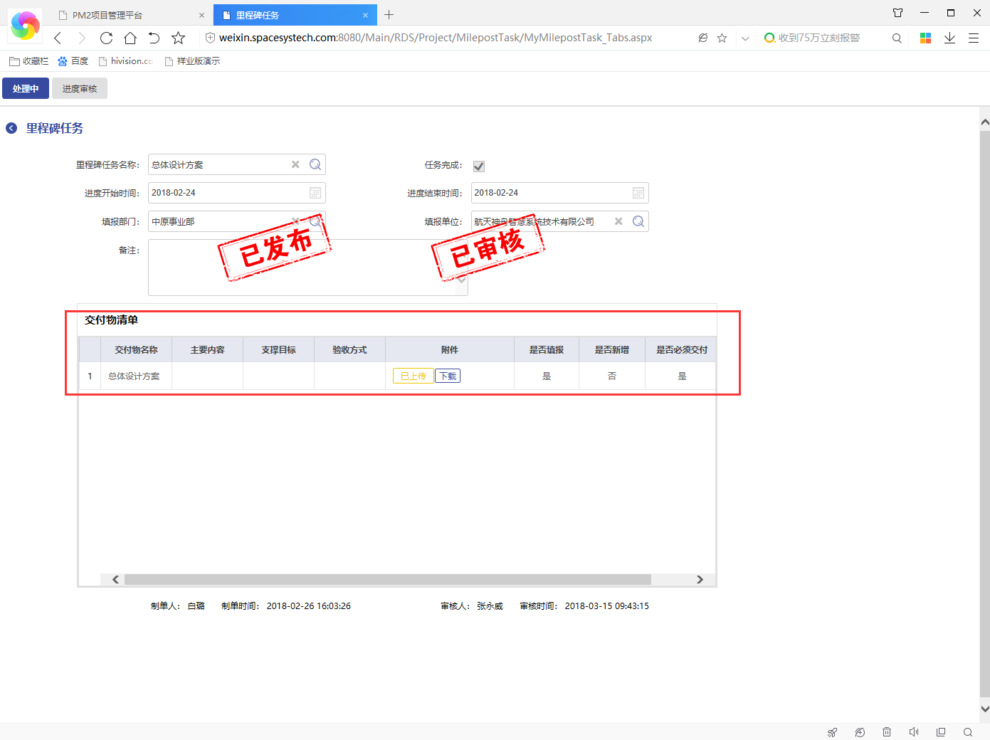 項(xiàng)目進(jìn)度管理面向管理層有宏觀的里程碑進(jìn)度分析,面向執(zhí)行層有可執(zhí)行的最小工作包,兼具不同角色需求產(chǎn)生不同的項(xiàng)目進(jìn)度分析結(jié)果。每一個(gè)里程碑、任務(wù)都可以設(shè)置一個(gè)或多個(gè)交付成果,當(dāng)交付成果為必須上傳時(shí),里程碑、任務(wù)上報(bào)時(shí)必須上傳否則無法上報(bào)。