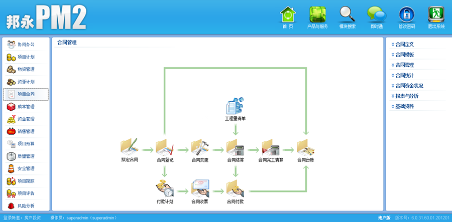 邦永PM2合同管理軟件能夠與邦永PM2系列產(chǎn)品的其他功能模塊(如:協(xié)同辦公、資金管理、物資管理、成本核算等)實現(xiàn)無縫對接,客戶在需要擴大自身系統(tǒng)的管理范圍時能任意擴展軟件功能模塊。