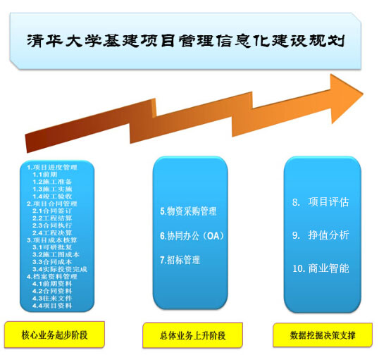 根據(jù)清華大學(xué)基建規(guī)劃處的業(yè)務(wù)的需求,合同規(guī)定購(gòu)買的PM2模塊包括:協(xié)同辦公(OA)、項(xiàng)目進(jìn)度管理、物資采購(gòu)管理、項(xiàng)目合同管理、成本投資管理、資金管理、招標(biāo)管理、檔案資料管理。此次實(shí)施采取的是:整體規(guī)劃、分步實(shí)施模式。