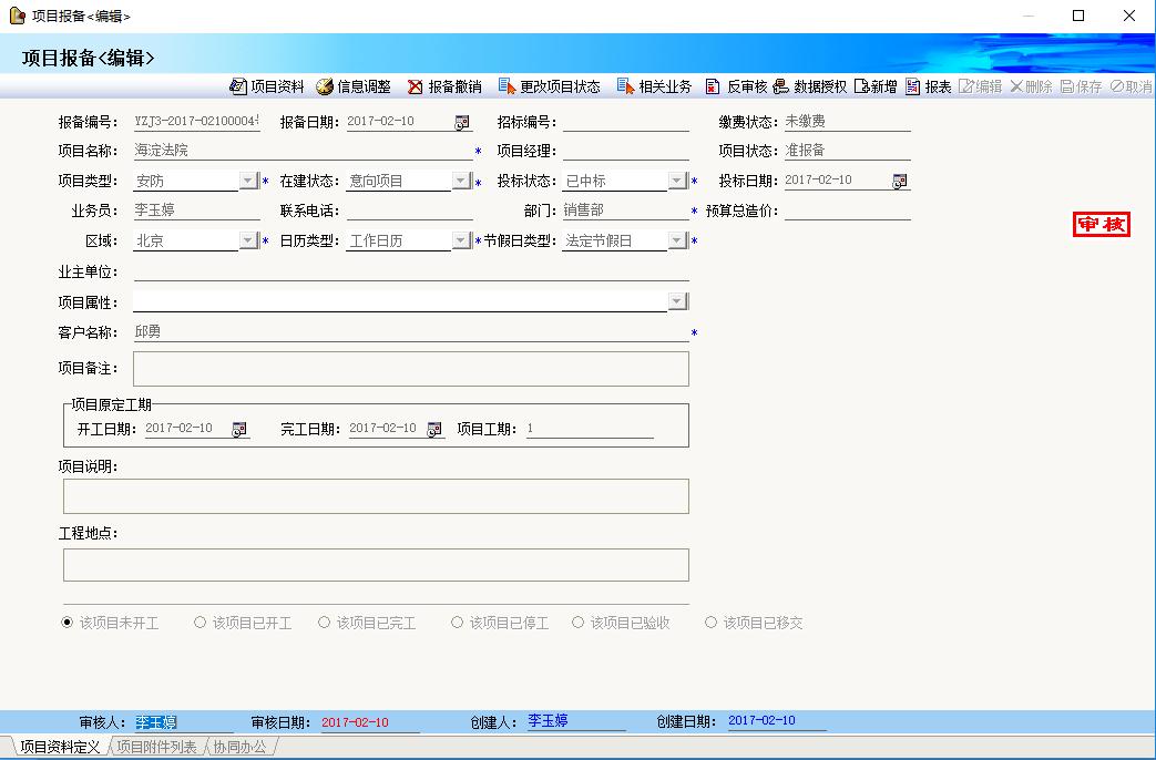 項目狀態(tài):未開工、已開工、已完工、已停工、已驗收、已移交;
