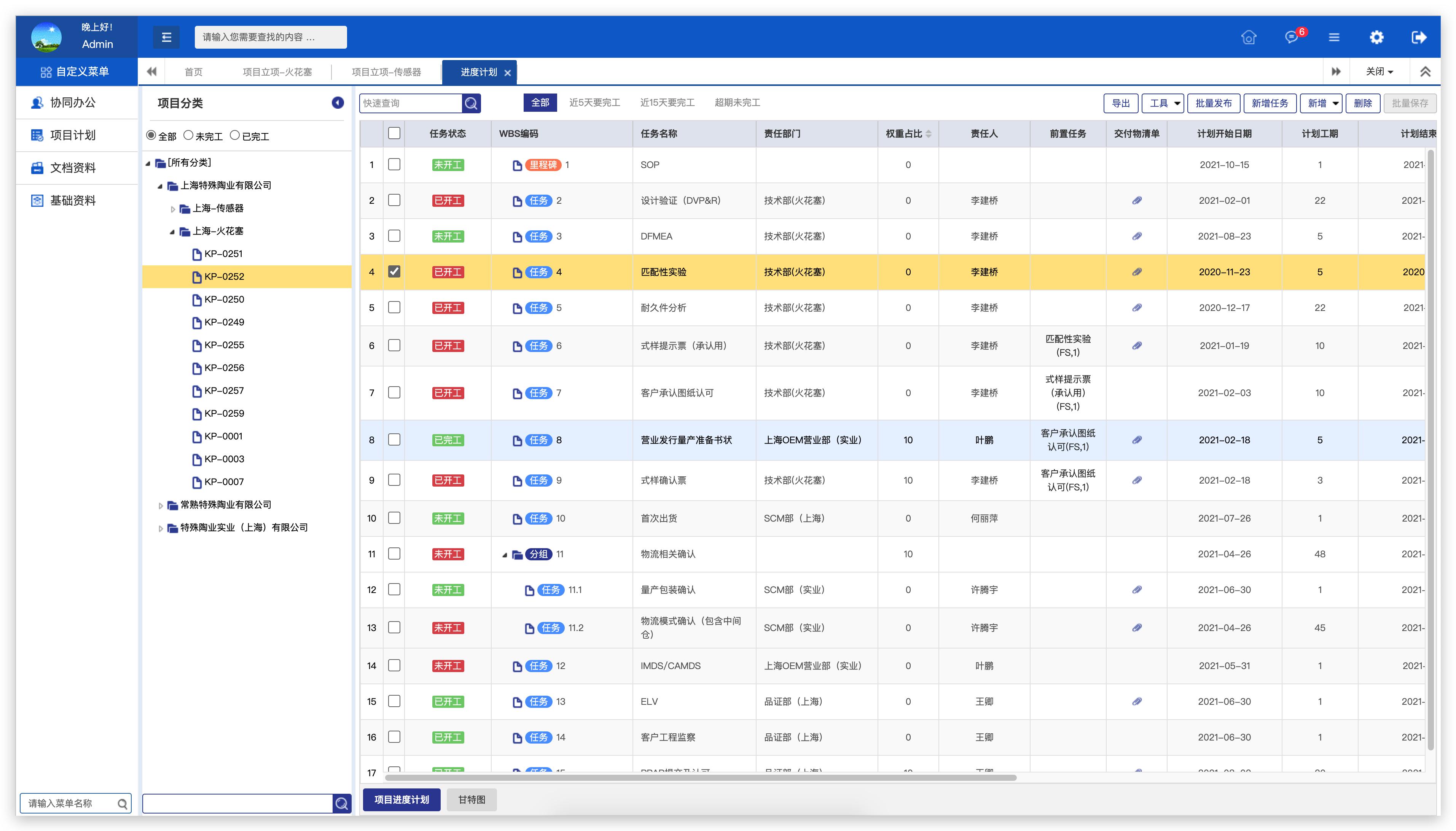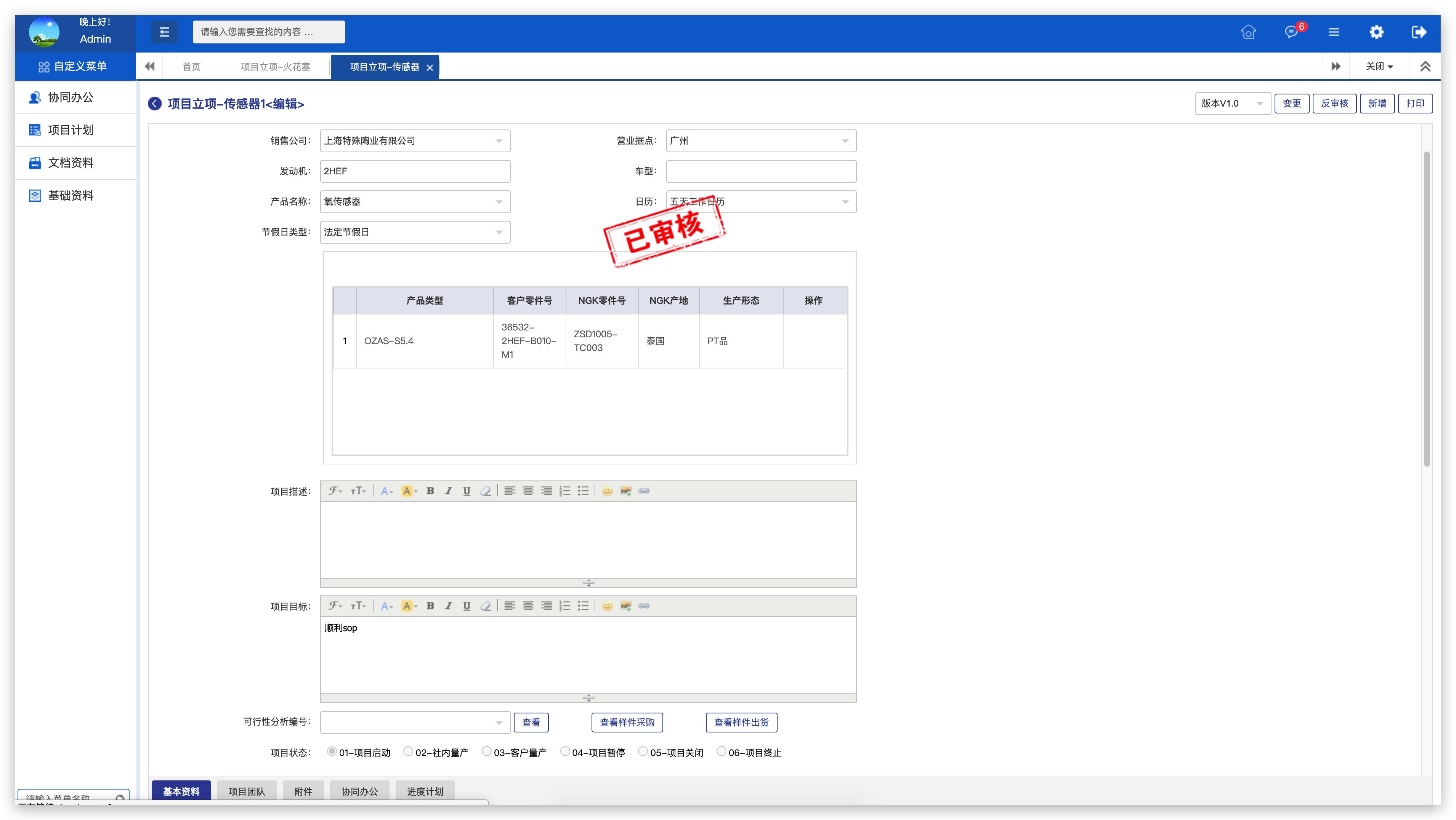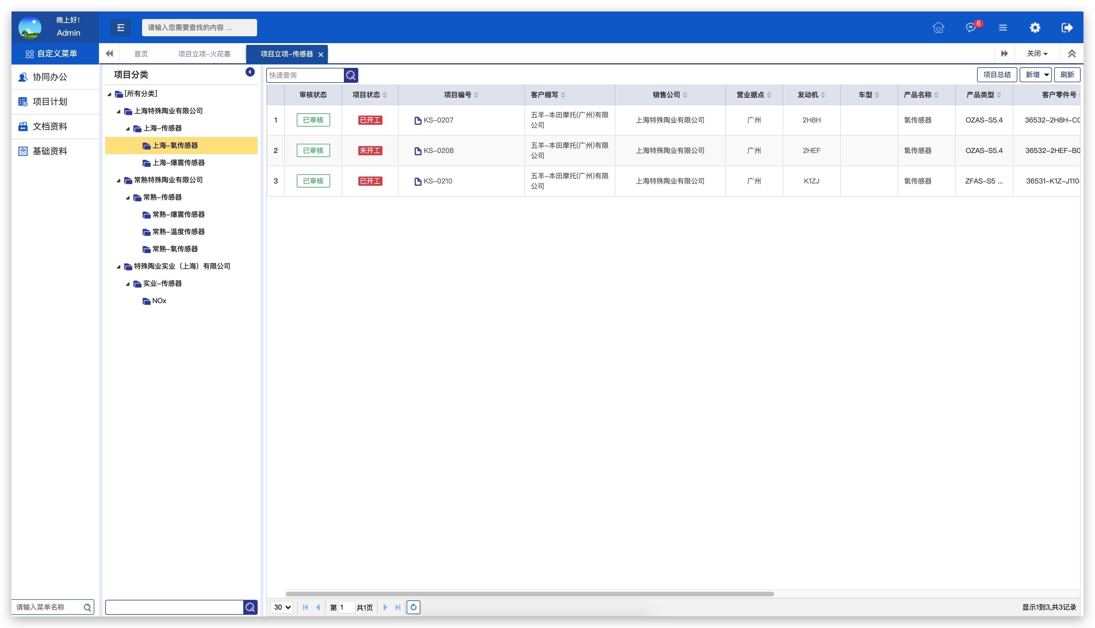 Ҏ(gu)陶业项目的cd先根据公品和三社分ؓ上vQ实业,常熟Q然后根据各C负责的产品建立二目录Q如火花塞,温度传感器,氧传感器Q爆震传感器{,由PMS部门q行目立项新增。最l审栔R过后,建立本项目的完整q度计划?/p>