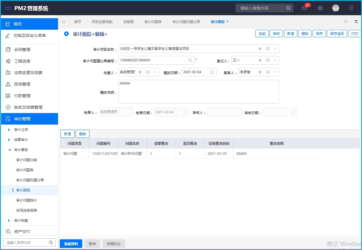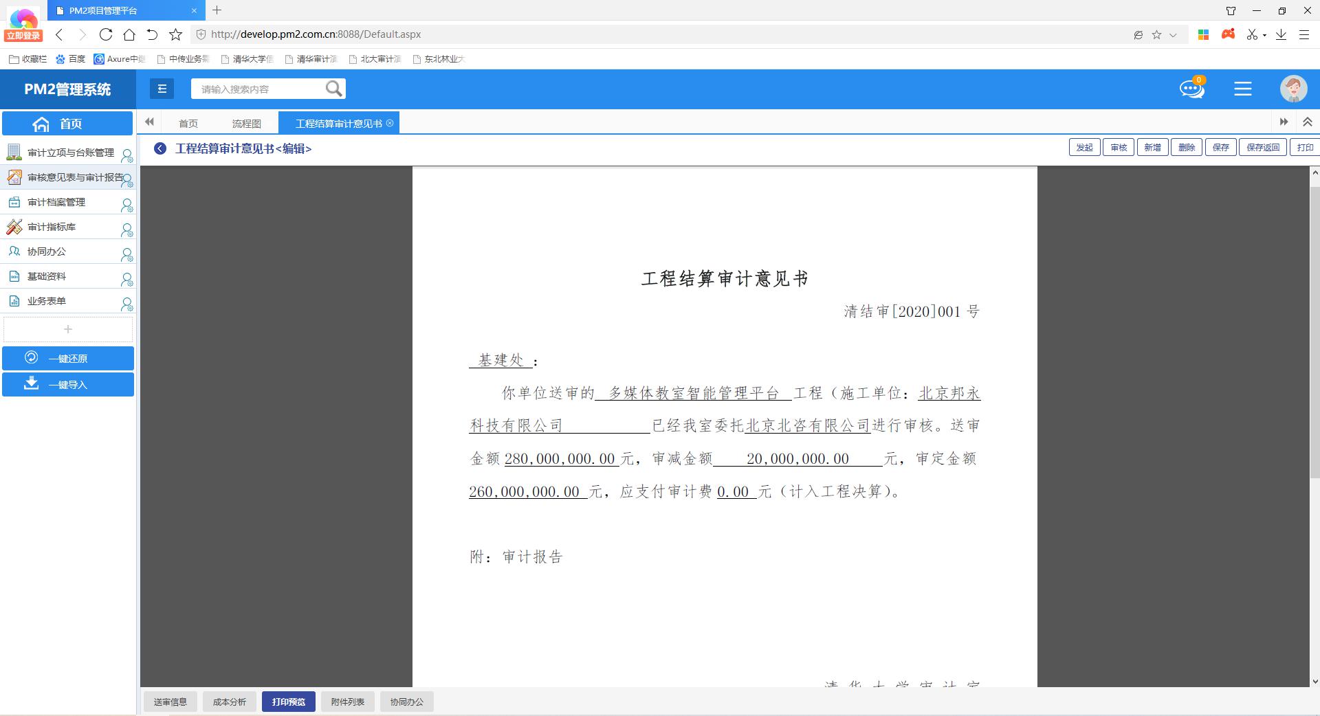 邦永PM2高校审计目理软g不仅实现了工E概审计、工E结审计、全q程跟踪审计、工E决审计全程U上办理Q包括上q四业务的送审登记表、审计委托书、审核意见表、审计意见书的在U填写和自动生成Qƈ能按工程、修~工E等不同目cd建立各种指标数据库,便于后箋跟踪审计工作的g伸?/p>