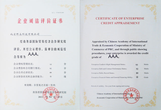 2012年04月05日,經(jīng)商務(wù)部國(guó)際貿(mào)易經(jīng)濟(jì)合作研究院歷時(shí)1個(gè)多月的全面評(píng)價(jià),并經(jīng)公示程序,我司獲得了商務(wù)部國(guó)際貿(mào)易經(jīng)濟(jì)合作研究院頒發(fā)的“AAA”企業(yè)誠(chéng)信評(píng)價(jià)證書(shū)。