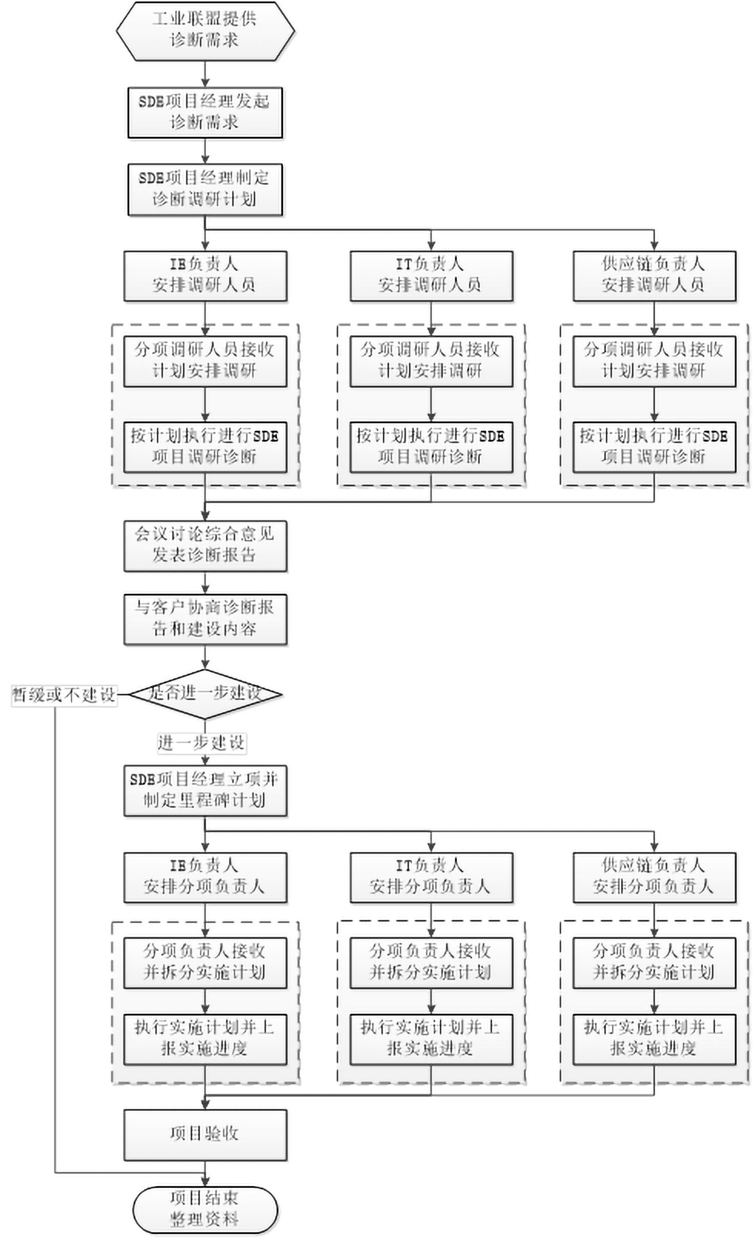 ? SDE項(xiàng)目診斷是由工業(yè)聯(lián)盟提供相應(yīng)需求,SDE項(xiàng)目經(jīng)理發(fā)起診斷需求,制定診斷計(jì)劃,各部門(mén)參與診斷工作,進(jìn)行客戶(hù)現(xiàn)場(chǎng)調(diào)研,最終形成診斷報(bào)告,并在客戶(hù)現(xiàn)場(chǎng)進(jìn)行報(bào)告的發(fā)布;