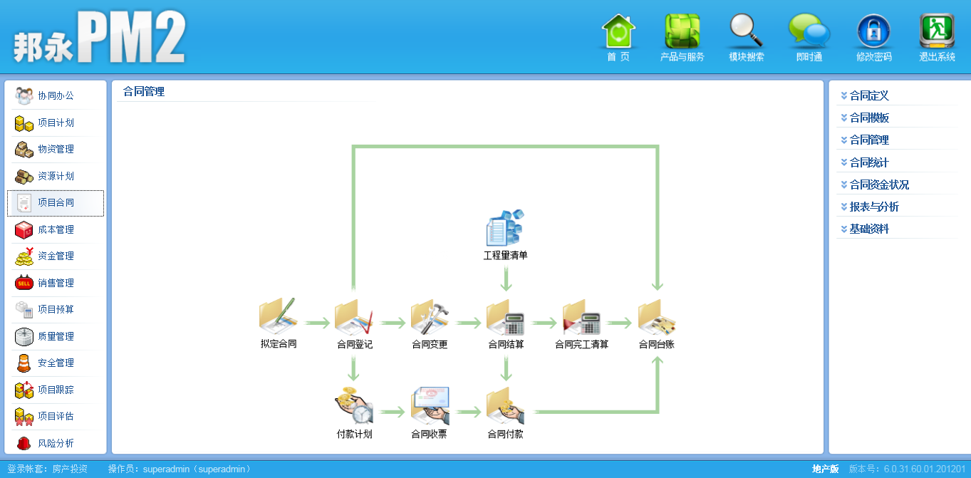 邦永PM2合同管理軟件能夠與邦永PM2系列產(chǎn)品的其他功能模塊(如:協(xié)同辦公、資金管理、物資管理、成本核算等)實現(xiàn)無縫對接,客戶在需要擴大自身系統(tǒng)的管理范圍時能任意擴展軟件功能模塊。