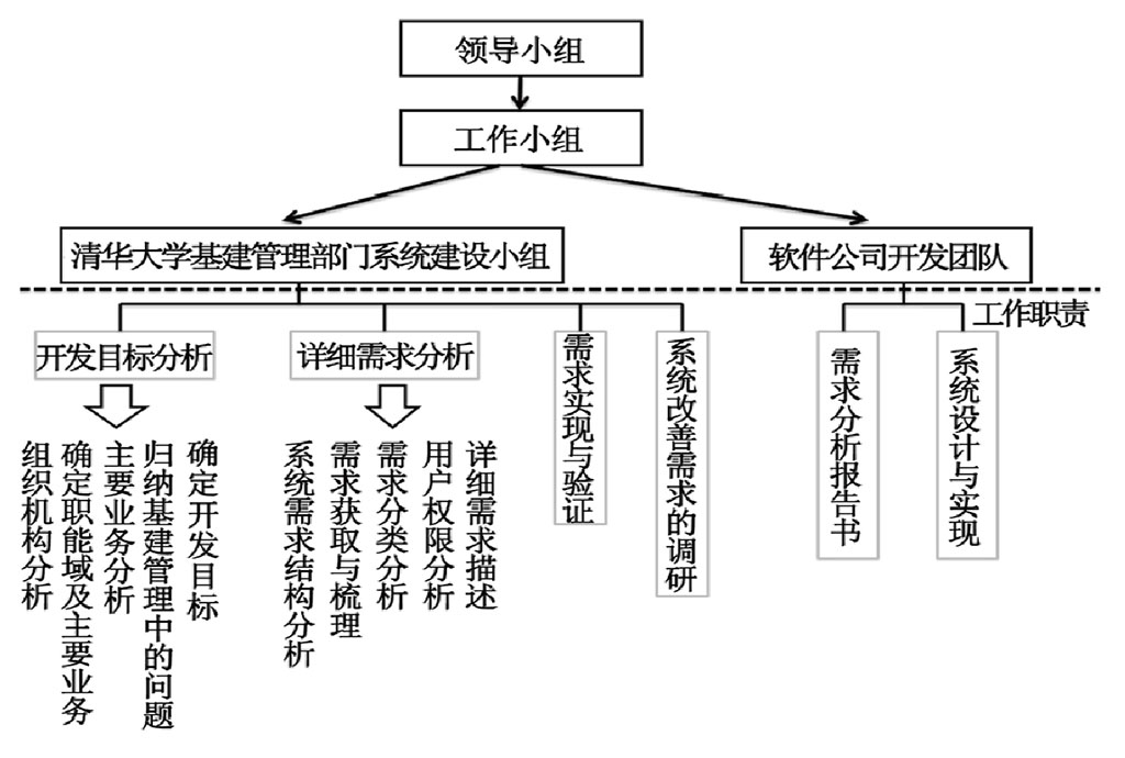 決定軟件開發(fā)成敗的關(guān)鍵性因素分別為用戶在軟件開發(fā)過程中的參與程度、軟件使用單位“一把手”對軟件開發(fā)事宜的重視與支持程度,以及用戶對自身需求的說明是否清晰準確[3]。而在實際開發(fā)過程中,最常見的影響因素則是軟件公司開發(fā)人員與用戶溝通方面的問題。針對這些關(guān)鍵因素,為提高管理信息系統(tǒng)開發(fā)的成功率,確定了清華大學(xué)基建管理信息系統(tǒng)開發(fā)的組織模式。
