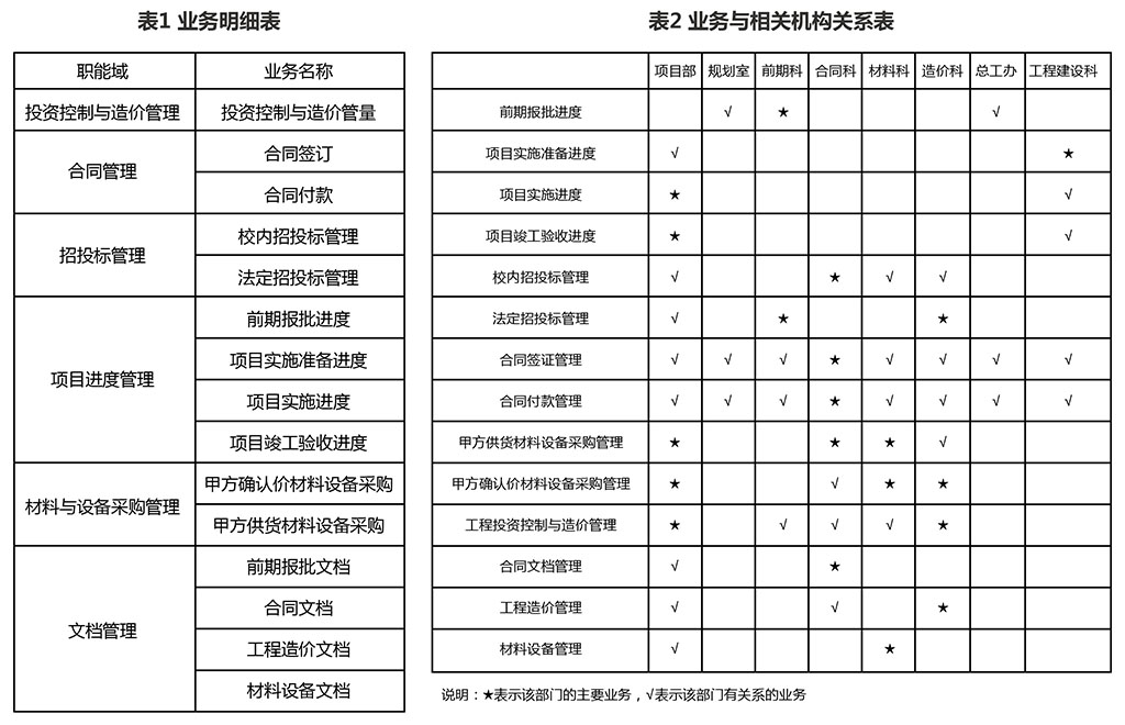 組織職能是為實現(xiàn)組織的管理目標,被賦予的職責(zé)和功能。一個職能域描述組織某一方面的職能。通過職能域的劃分,可以有效地將不同職能進行優(yōu)化組合。清華大學(xué)基建管理部門的工作分為六個職能域,分別是:投資控制與造價管理、合同管理、招投標管理、材料與設(shè)備管理、項目進度管理、信息傳遞與文檔管理。確定職能域后,可通過對職能域中所含業(yè)務(wù)及其流程進一步研究,更加詳細地了解組織中存在的問題。
