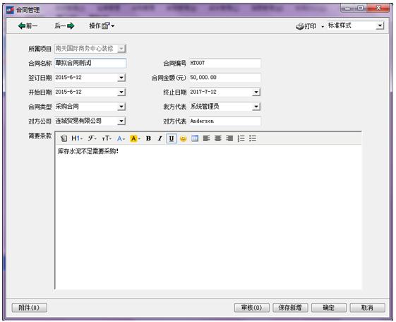 (1)根據(jù)項(xiàng)目新建合同,可以根據(jù)需要建立各種類型的合同;